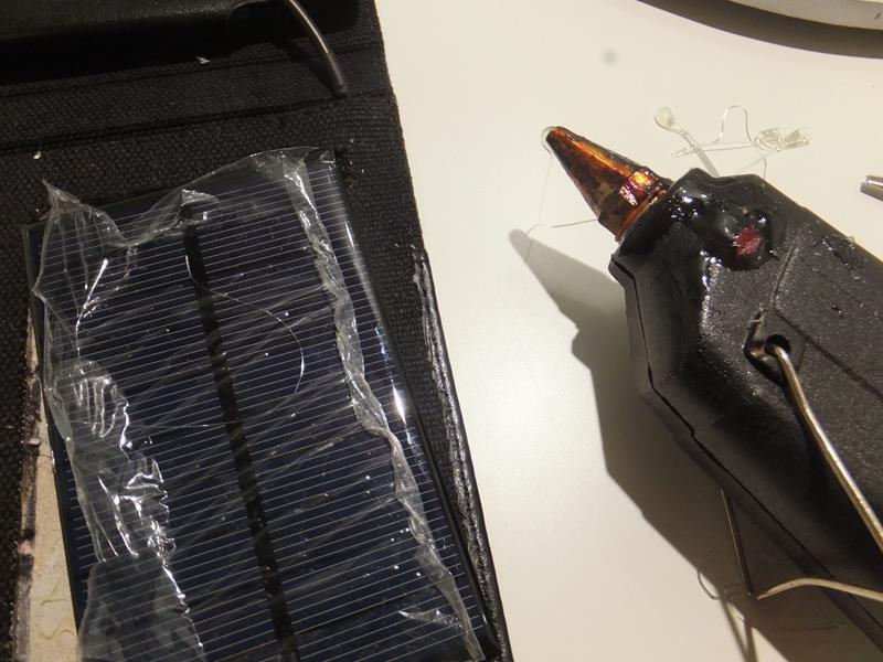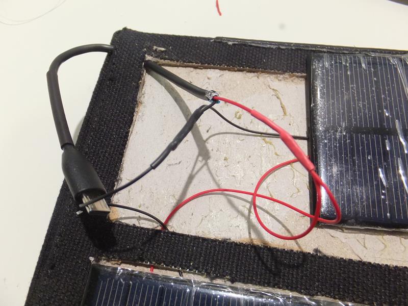 Pasamos los cables por debajo del forro de la funda y conectamos los cables de las placas al conector micro usb: Pegamos las placas solares en los huecos a que van destinadas: Y ya está!